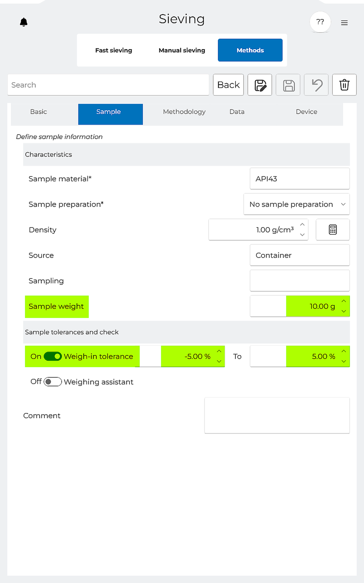 "Asistent váženia" sa môže používať výlučne s analytickými sitami RETSCH a dá sa v metóde jednoducho aktivovať/deaktivovať.