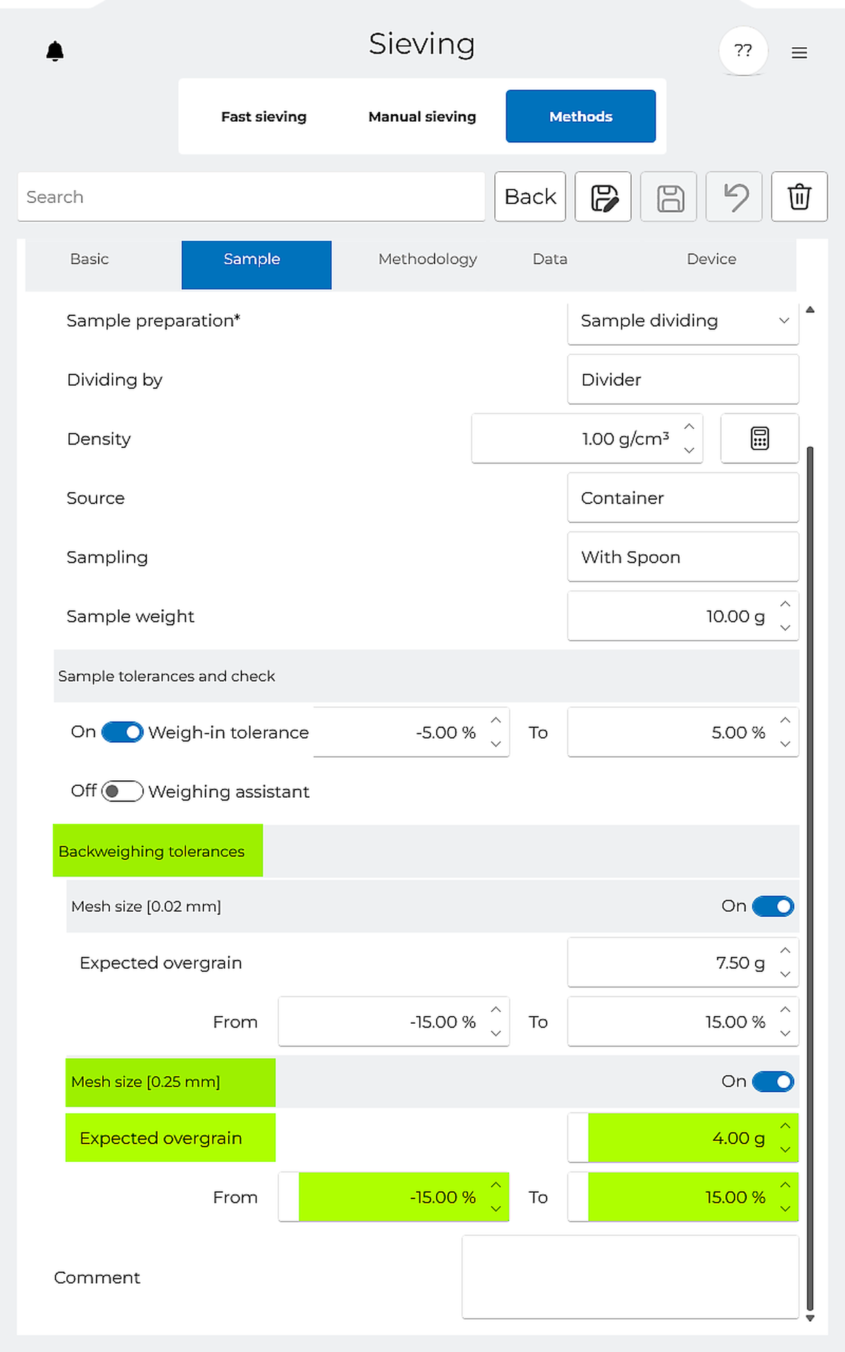 Spĺňa vaša vzorka prednastavené limity kvality? S toleranciou spätného váženia môžete zabezpečiť, aby veľkosť častíc a distribúcia veľkosti častíc vzorky spĺňali vaše požiadavky.