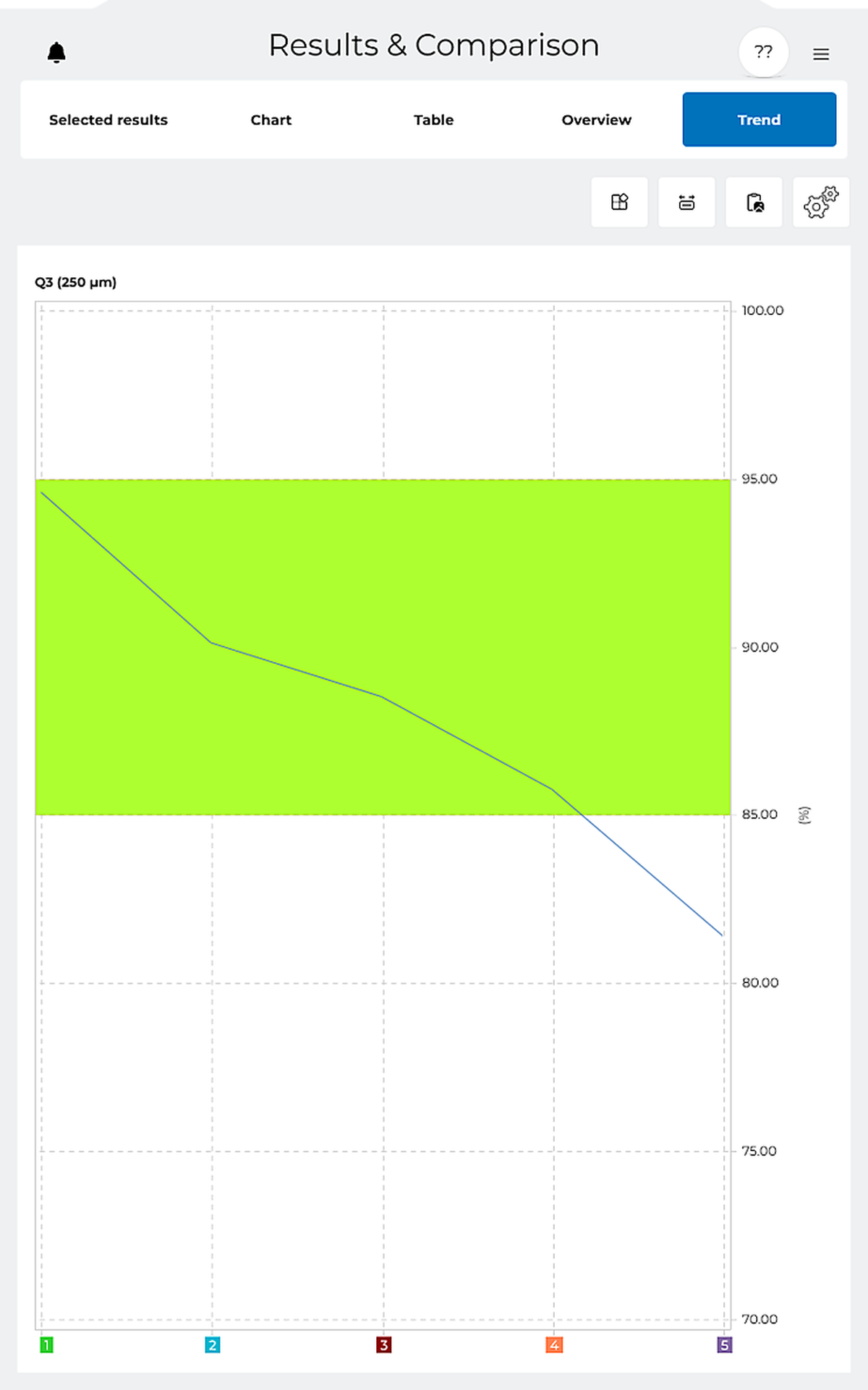Analýza trendov vám umožňuje porovnať niekoľko procesov sitovania na základe voľne voliteľných parametrov. Vďaka tomu môžete využívať výhody jednoduchého a spoľahlivého monitorovania rôznych kritérií kvality.